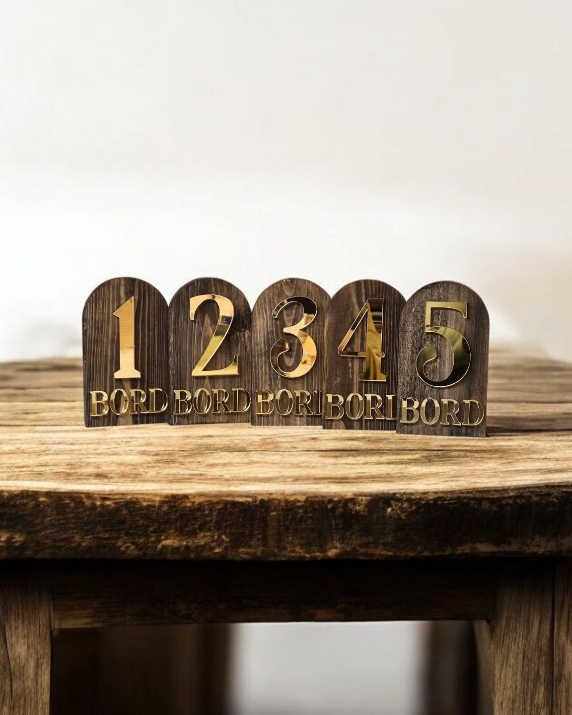 Skab en rustik og imponerende atmosfære med vores 3D bordnumre. Disse unikke skilte i træ tilføjer dybde og charme til din begivenhed. Giv dine gæster en mindeværdig oplevelse ved at guide dem til deres pladser på en unik og stilfuld måde.