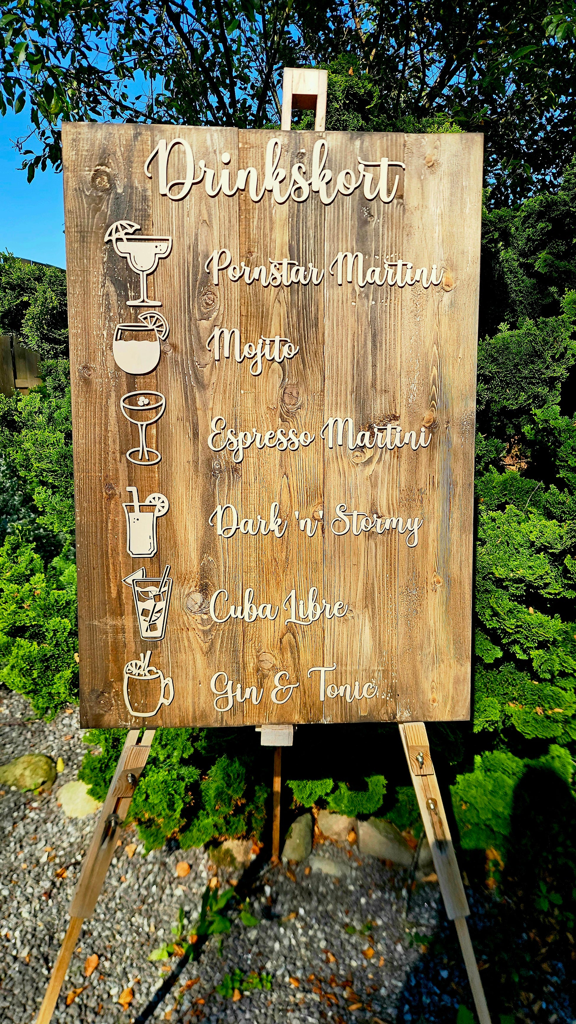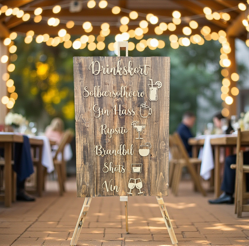 Drinknavnene udføres i ophøjede 3D-bogstaver, som giver et eksklusivt og håndlavet udtryk. Små ikon-detaljer kan tilføjes for ekstra karakter. Skiltet egner sig særligt godt til bryllup, jubilæum, firmafest og andre arrangementer med fokus på æstetik og naturlige materialer.