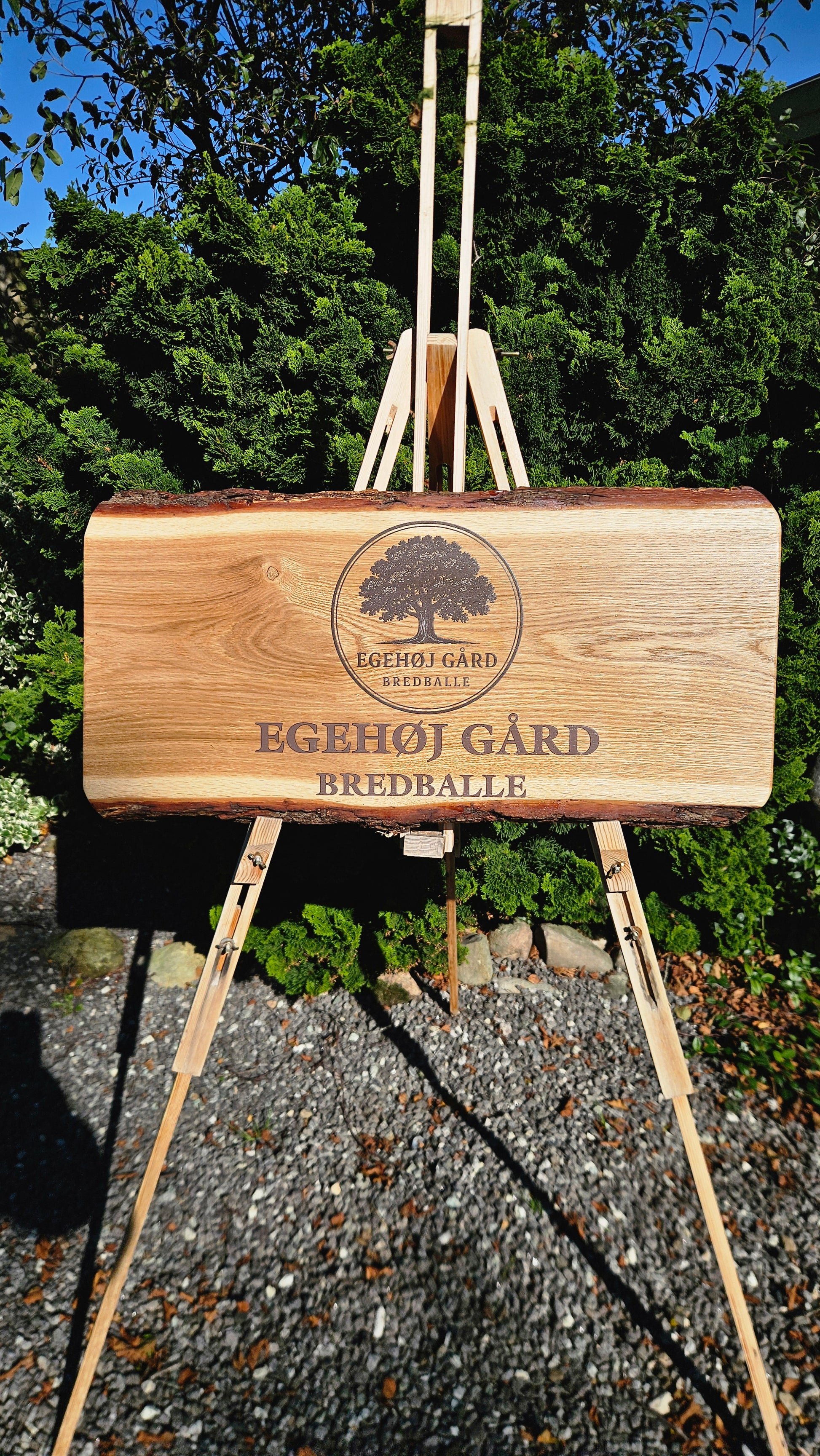 Vi fremstiller skilte i massivt egetræ med UV-print og skibslak, der gør dem velegnede til udendørs brug året rundt.