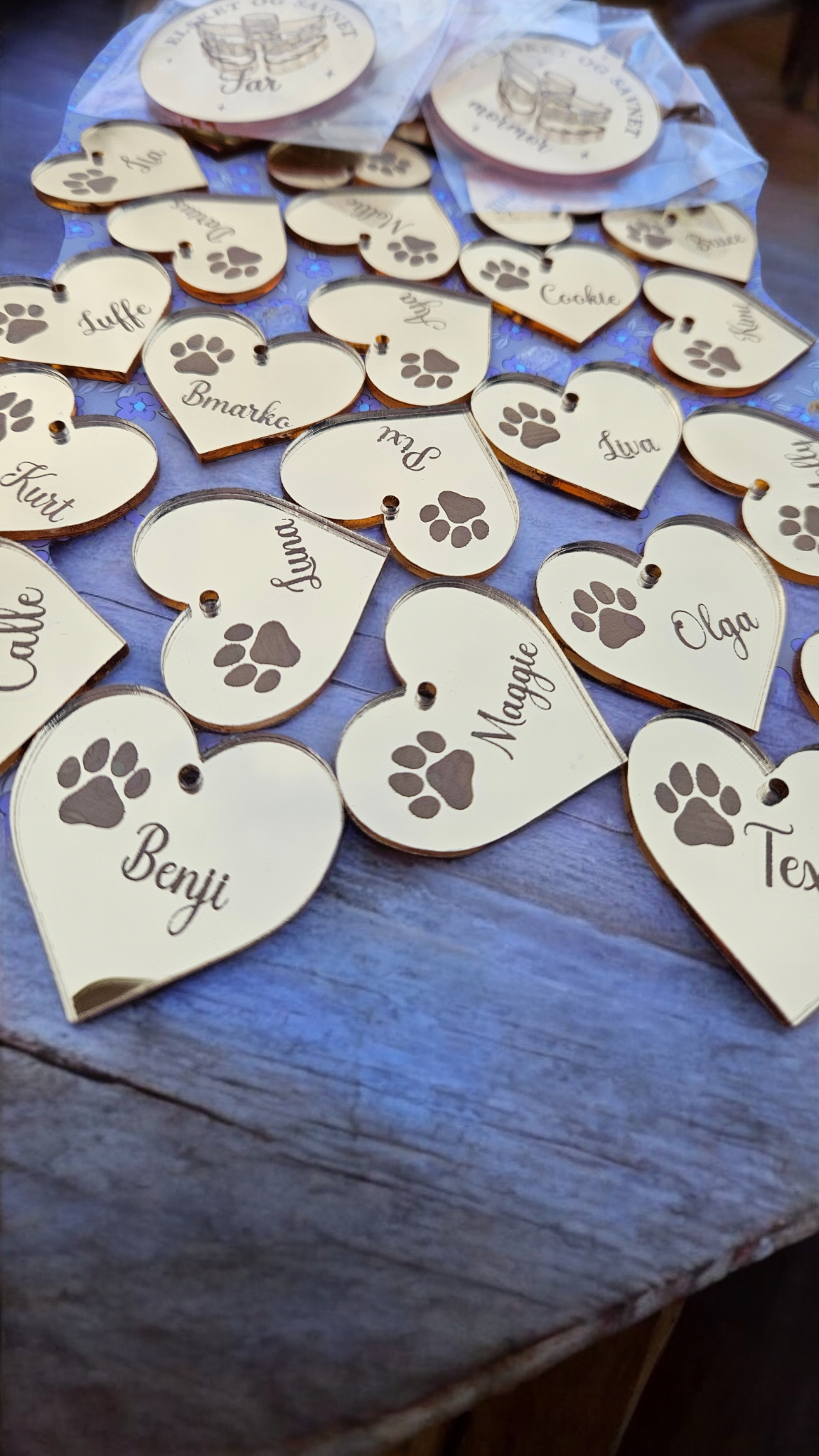Få graveret dit kæledyrs navn og poteaftryk på et smukt hjerte i guld eller sølv spejlakryl ✨