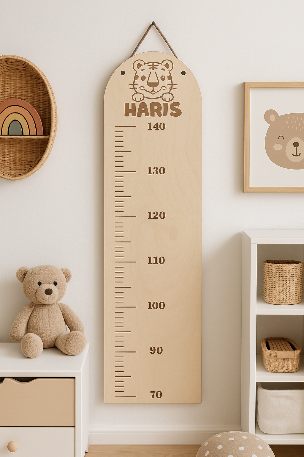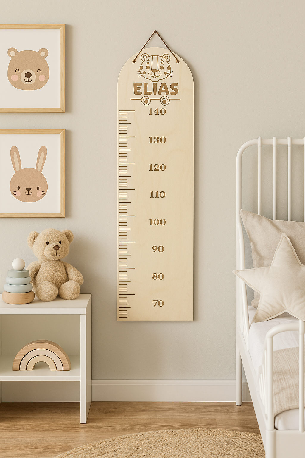 Højdemåleren kan personliggøres med barnets navn og fødselsdato, hvilket gør den til et varigt minde og en skøn gaveidé til dåb, fødselsdag eller babyshower.