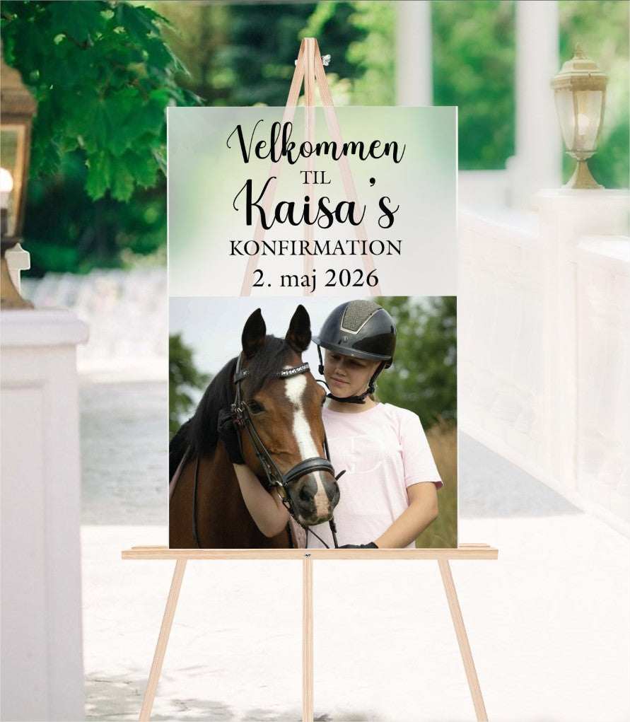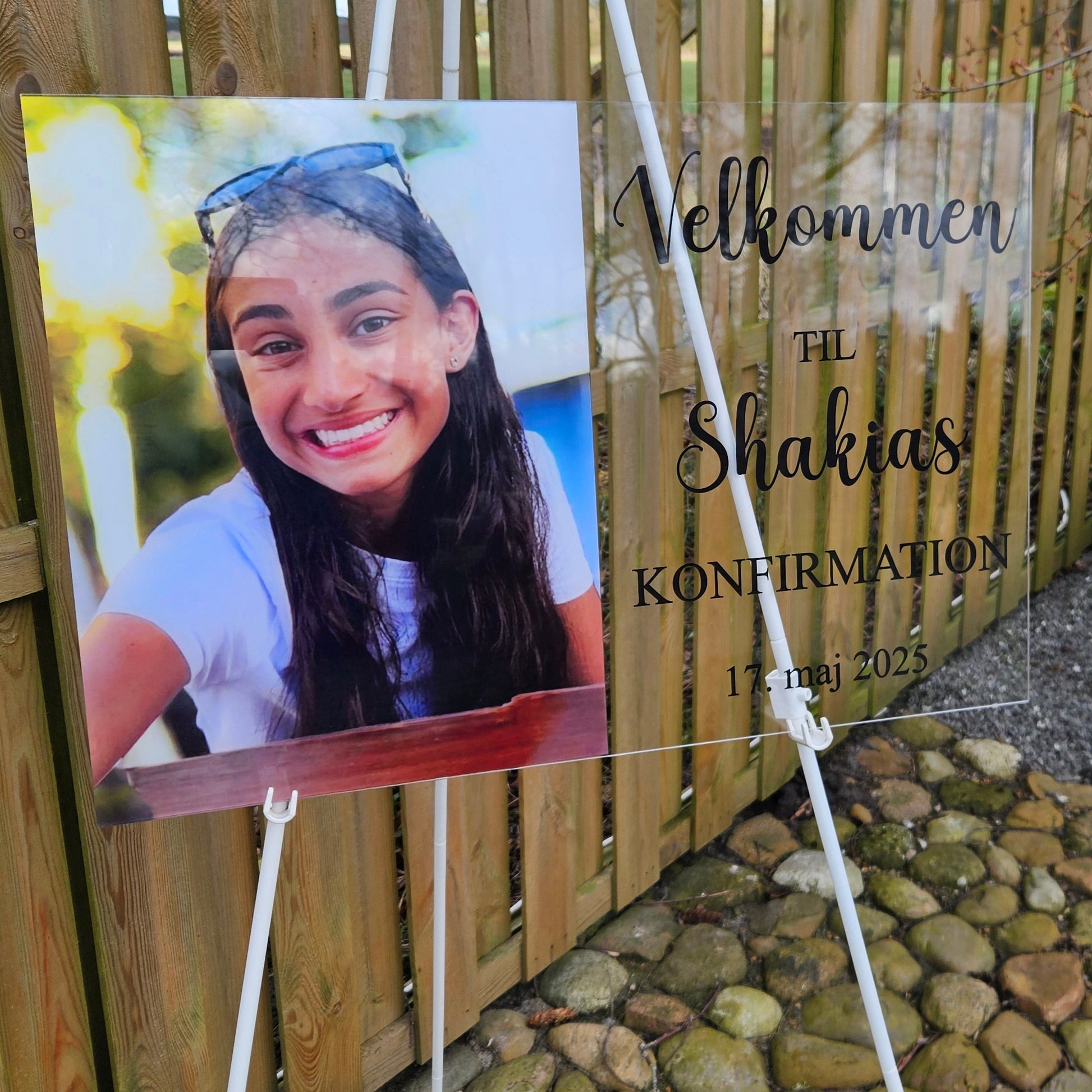 Personligt velkomstskilt til konfirmation med eget billede. UV-print på klar akryl, frostet akryl eller skiltekarton i størrelsen 40 × 60 cm.