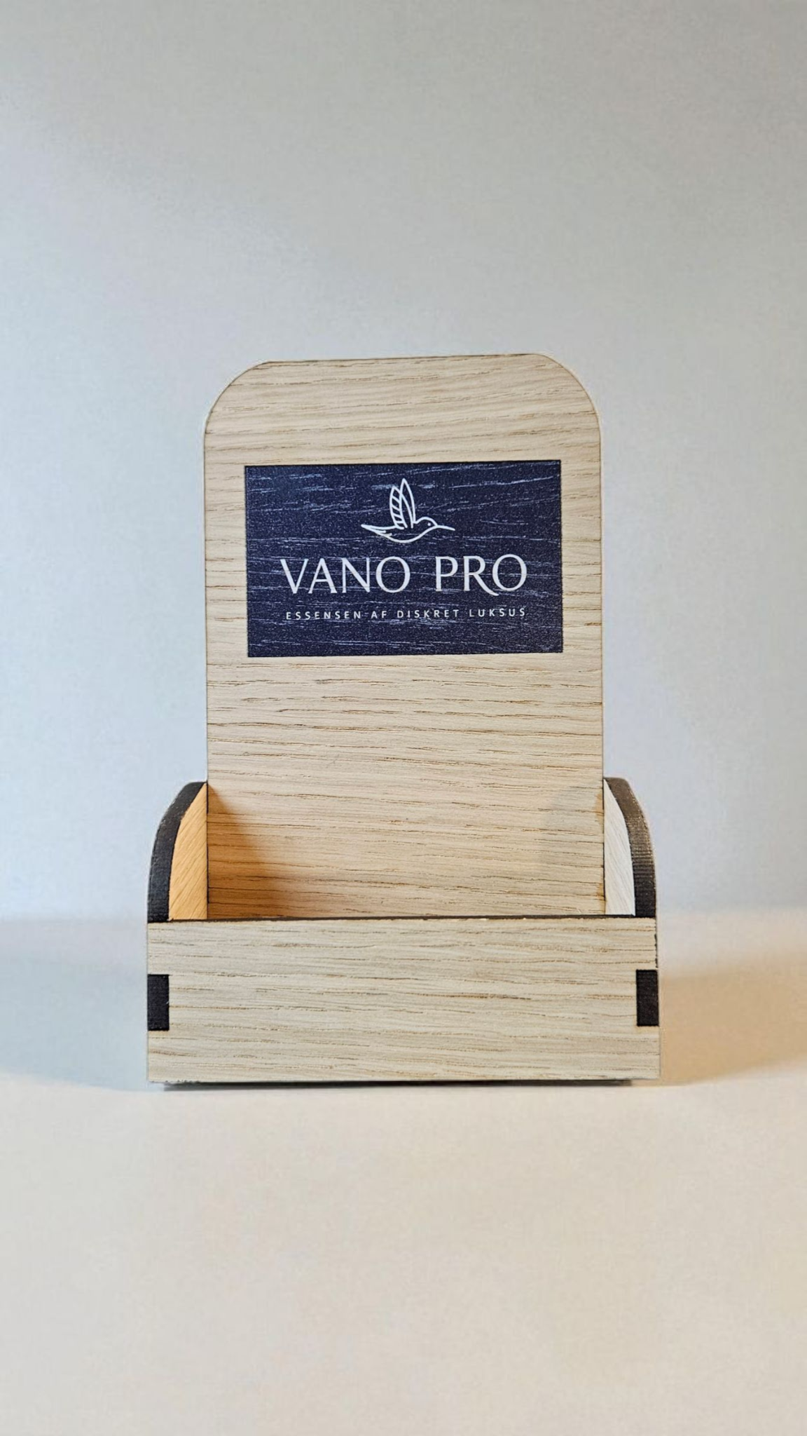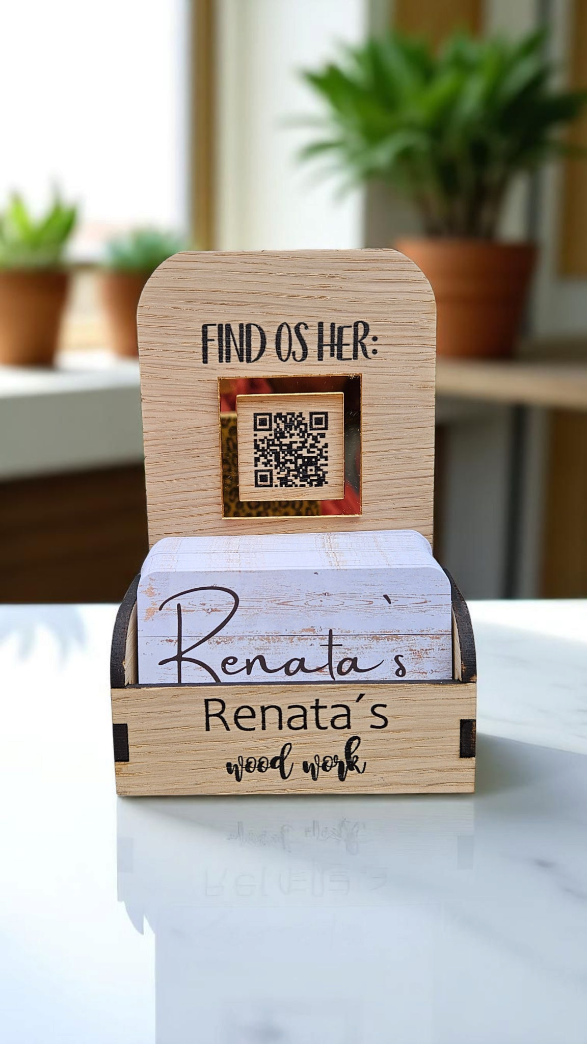 Denne elegante kortholder i træ er både praktisk og dekorativ. Den er designet til at holde visitkort, informationskort eller små flyers på en stilren og professionel måde.
