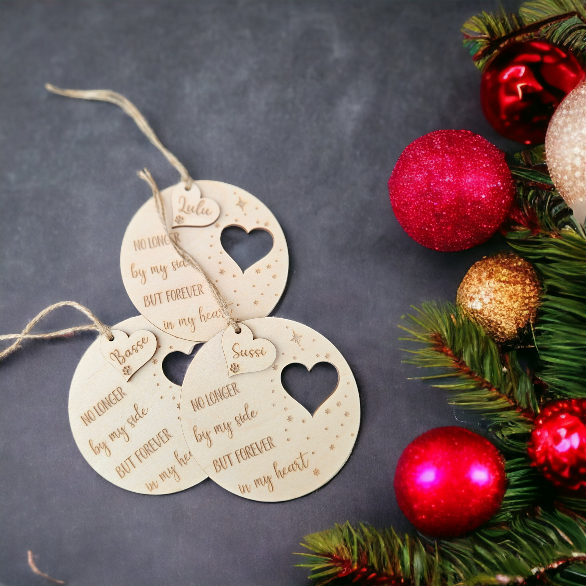 Hver dekoration har et udskåret hjerte og en lille plade med dit kæledyrs navn.