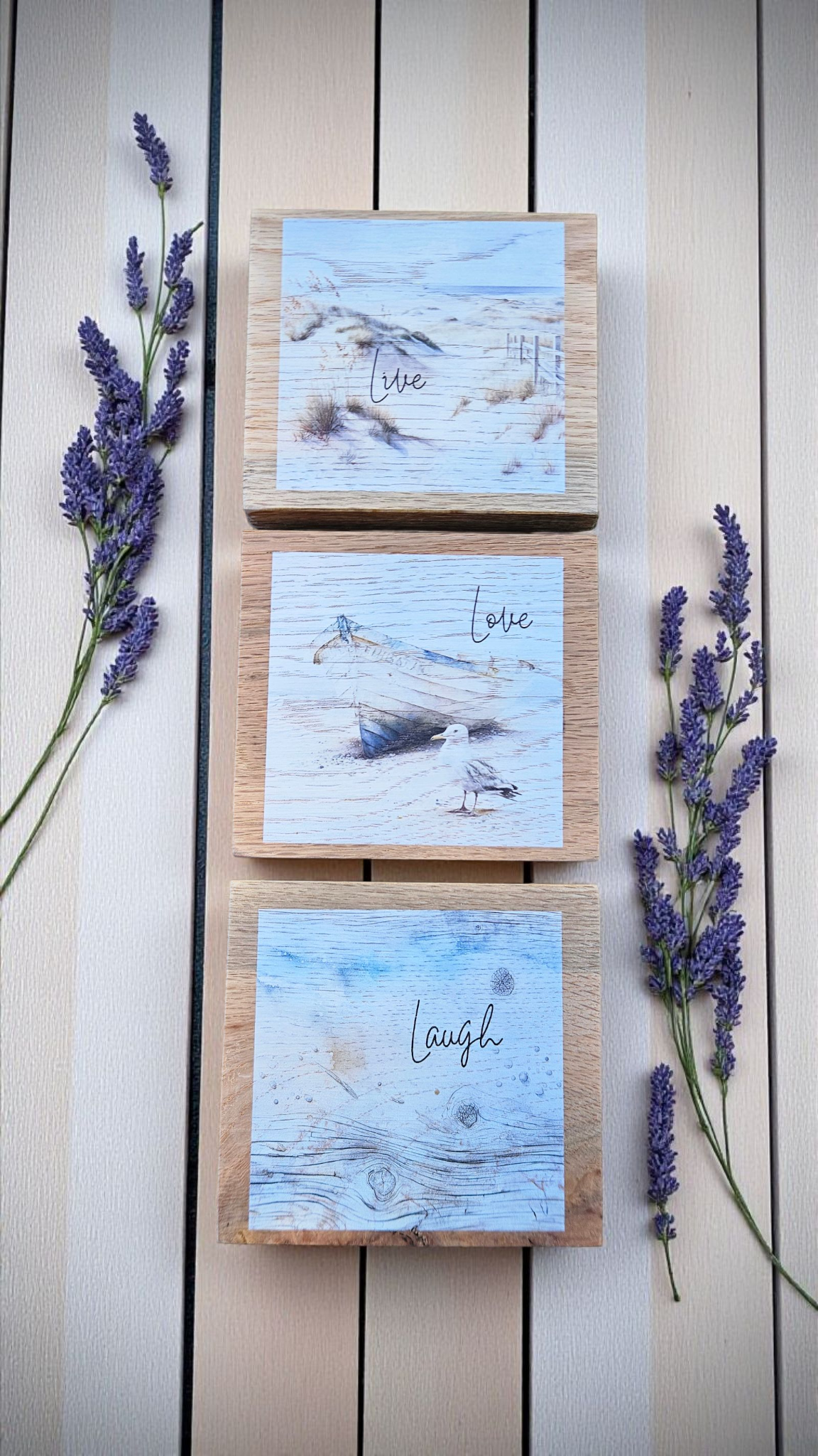 Motiverne Live, Love, Laugh giver et roligt og sommerligt udtryk, der passer perfekt til både hjem og sommerhus.