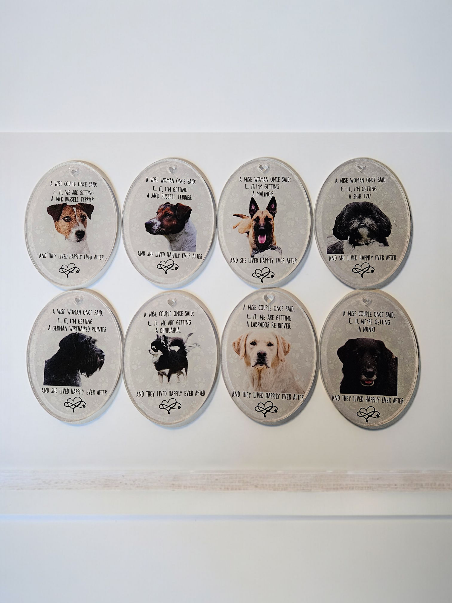 Vedhæng med dit eget foto og hunderacen. Baggrunden kan også være i lyserød, grå eller grøn.