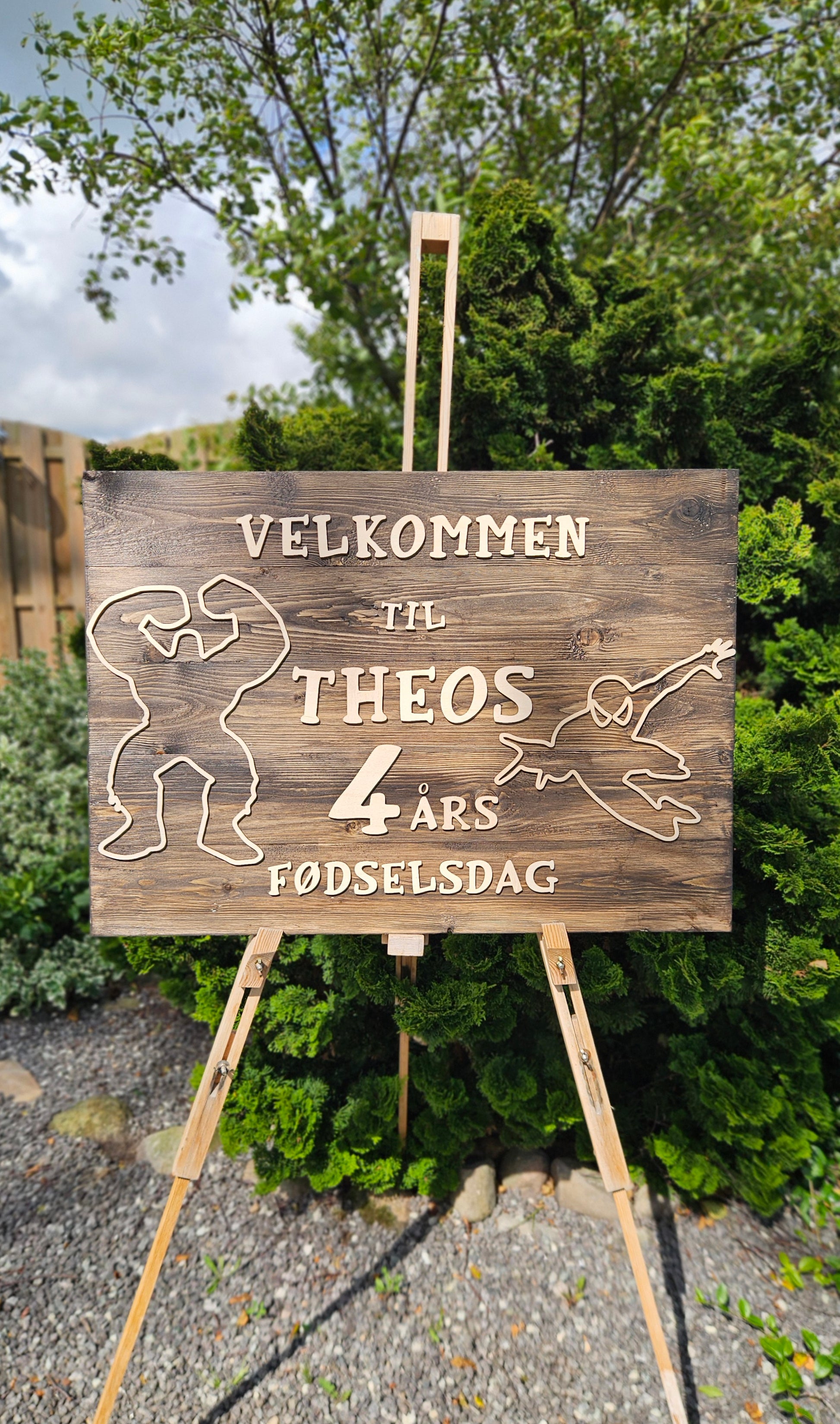Det rustikke træ kombineret med de lyse, ophøjede elementer giver skiltet et naturligt og tidløst look, som passer smukt til fejringen af de mindste. Skiltet personliggøres med navn, alder og eventuel tekst og byder gæsterne velkommen på en overskuelig og charmerende måde.