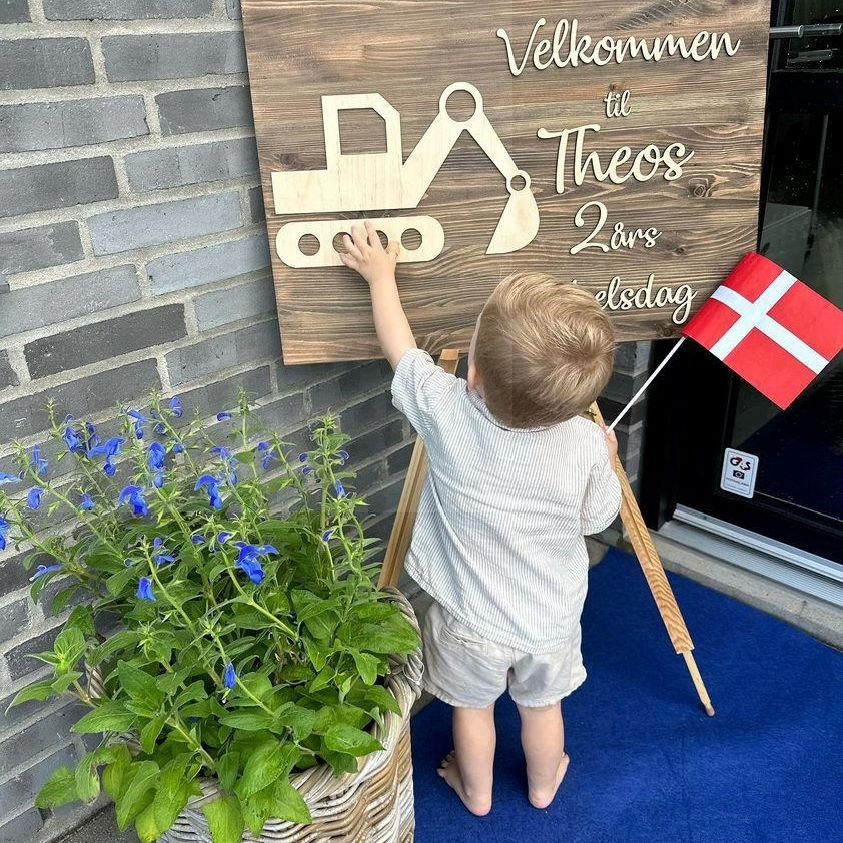 Dette personlige velkomstskilt i massivt træ er designet til børnedåb, navngivning og fødselsdag og tager udgangspunkt i barnets egne ønsker og interesser. Skiltet kan tilpasses med et 3D-motiv efter jeres valg – fx maskiner, dyr, figurer eller andre temaer – og skaber et varmt, legende og personligt udtryk.