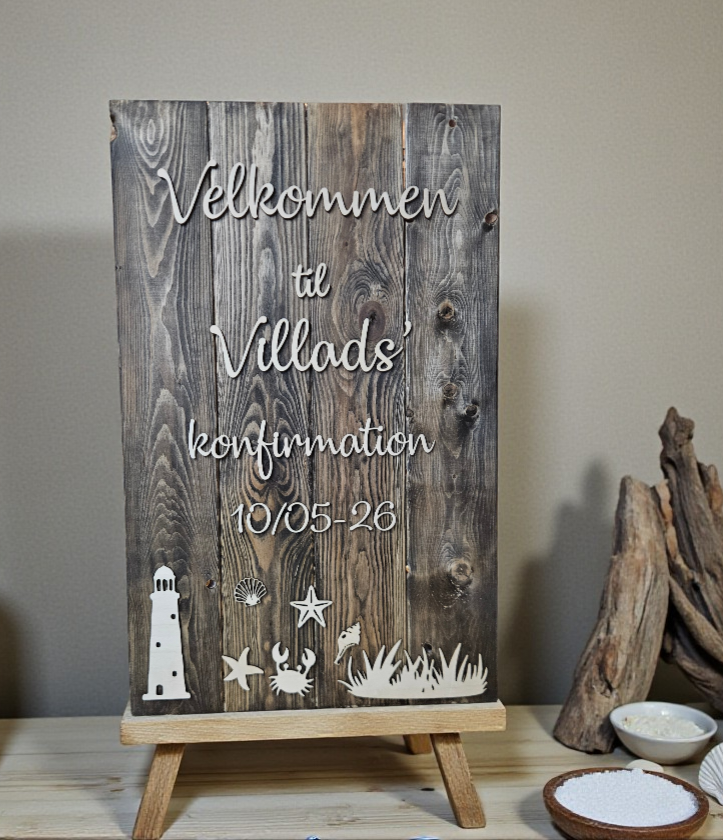 Dette personlige velkomstskilt i massivt træ er designet til konfirmation og dekoreret med fine maritime detaljer som fyrtårn, søstjerner og strandmotiver. Det rustikke træ kombineret med de lyse, ophøjede elementer skaber et roligt og tidløst udtryk, der passer perfekt til konfirmationer med natur- eller havinspireret tema.